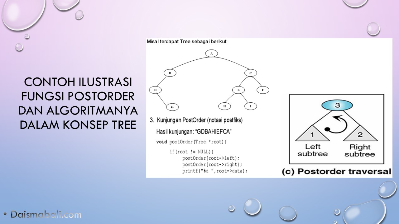 Proses Traverse yang melakukan tahapan kunjungi left node, kunjungi right node, cetak node yang dikunjungi. Berikut Ilustrasi PostOrder dan Algoritma dalam Fungsi Traverse :