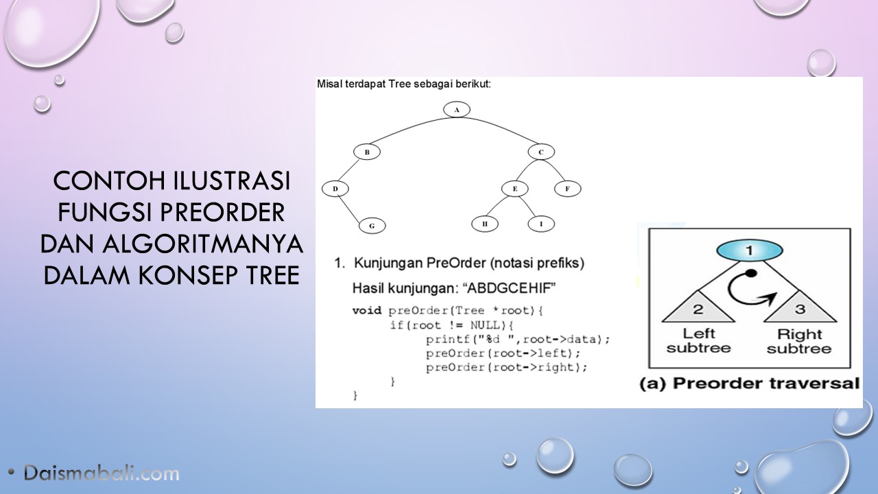 Proses Traverse yang melakukan tahapan cetak node yang dikunjungi, kunjungi left node , kunjungi right node. Berikut Ilustrasi PreOrder dan Algoritma dalam Fungsi Traverse :