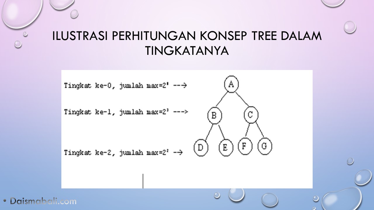 Jadi Dari Contoh Diatas untuk tingkat ke 0 hanya dapat membuat 1 Node karena jika diperhatikan dengan Rumus 2 pangkat n maka hasil yang didapat adalah 2 pangkat 0 = 1. Sedangkan pada Tingkat Ke 1 hanya dapat membuat 2 node karena 2 pangkat 1 = 2. Sedangkan untuk mengetahui berapa banyak node dalam sebuah tree dari contoh diatas yaitu ada 3 tingkatan ( 0,1,2) maka bisa didapat jumlah semua node dalam tree yaitu 2 pangkat 3 -1 = 7.