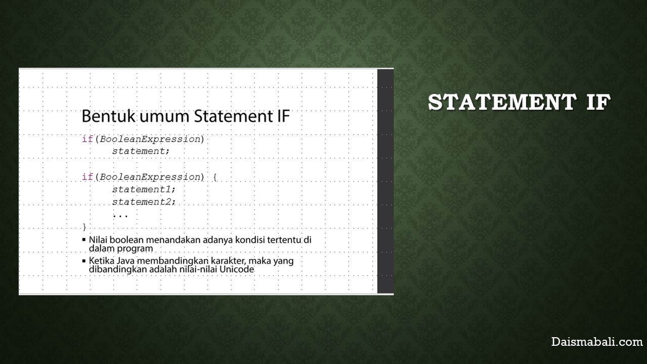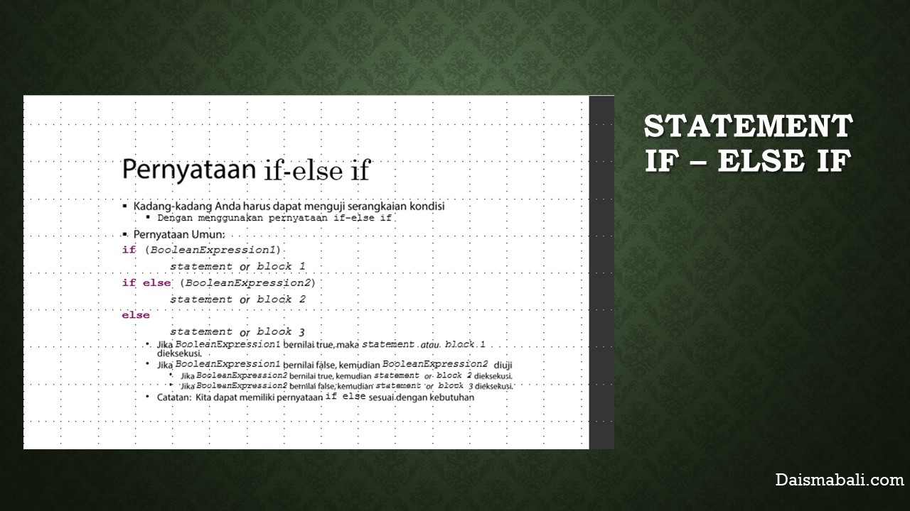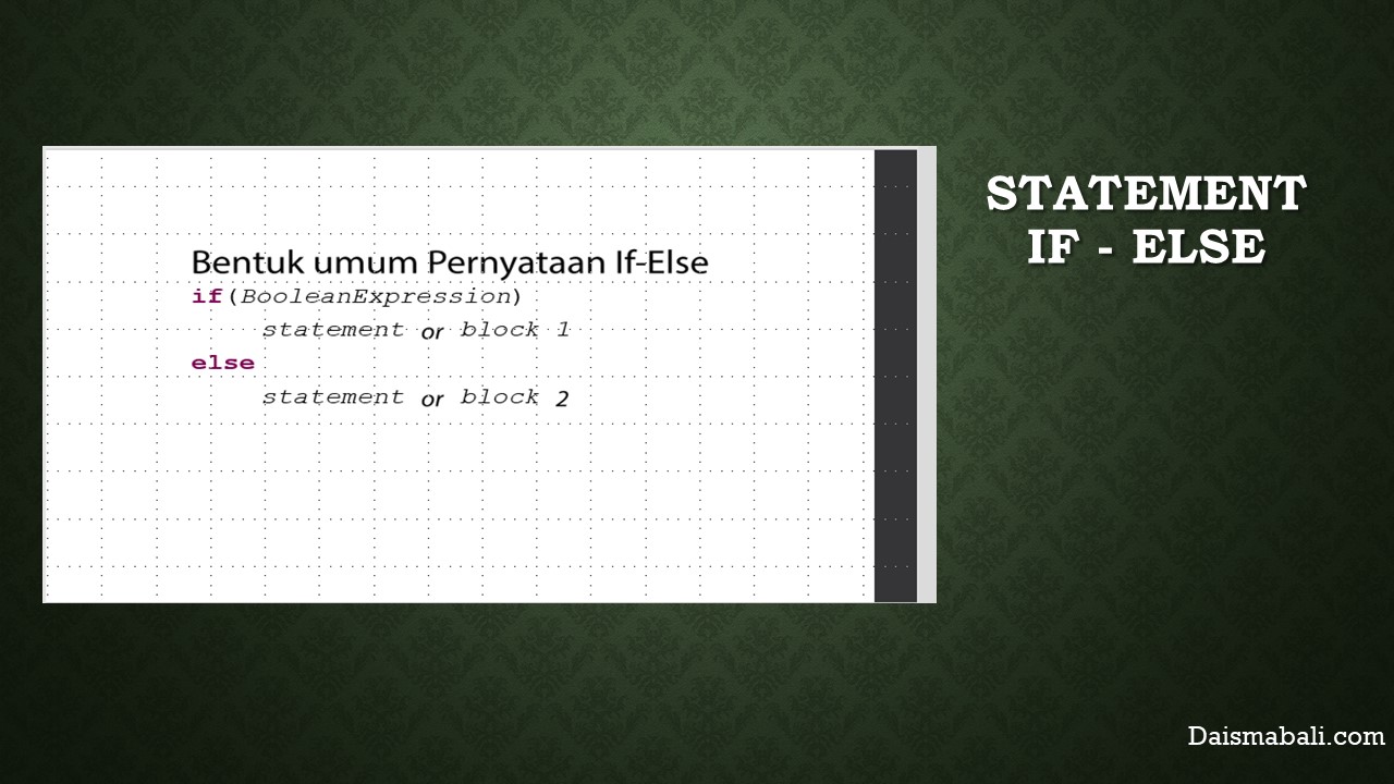 Pada Pernyataan If ada pernyatan Else yang apabila nilai boolean pada statement bernilai false maka pada pernyataan else yang dijalankan berikut pernyataan If – Else