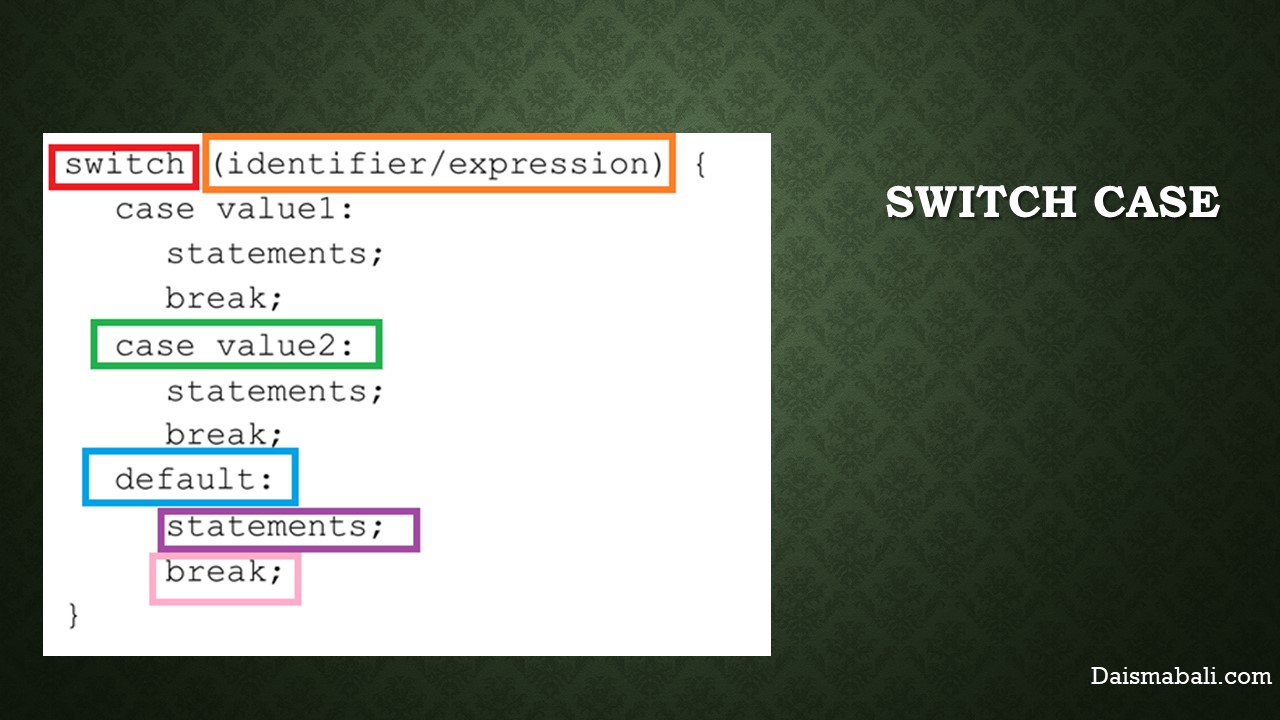 Pada setiap Case berisi nilai dan daftar pernyataan / statement yang nantinya yang dieksekusi adalah pernyataan yang memilki case yang nilainya sama dengan ekspresi.